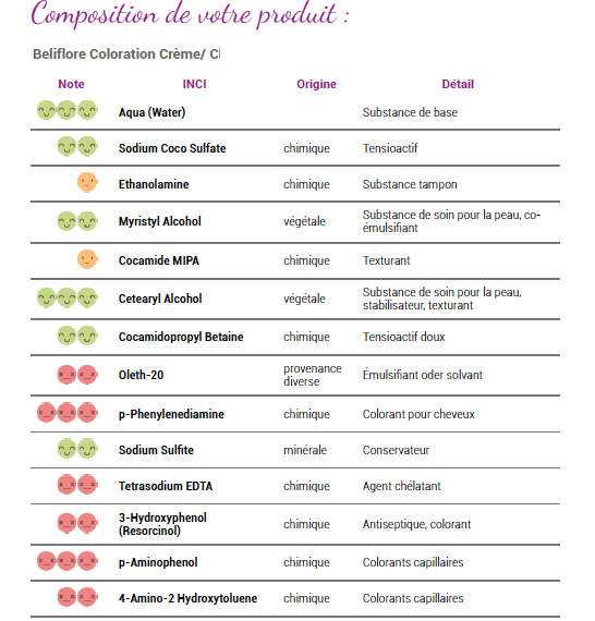 Après l’eau (en première position) se trouve déjà en troisième position un agent tampon chimique problématique l’Ethanolamine, suivi d’une liste de composants jusqu’à la 7ème position que l’on pourrait qualifier d’additifs secondaires, il s’agit de texturants, de tensioactifs, d’émulsifiants, de composants qui interviennent sur la qualité de la texture, mais qui n’ont pas de propriétés colorantes. Après tout, il s’agit ici d’une crème colorante et non d’un après-shampoing ou d’un soin du cheveux. C’est à partir de la 8ème position que Beliflor quitte le chemin du naturel et sort la charge de l’artillerie lourde : solvant de synthèse Oleth-20 (8ème) et surtout une flopée de colorants chimiques p-Phenylenediamine (9ème) 3-Hydroxyphenol (Resorcinol) (12ème) p-Aminophenol (13ème) 4-Amino-2 Hydroxytoluene (14ème) 2 -Methylresorcinol (15ème) Phenyl Methyl Pyrazolone (16ème) 2-Amino-4- Hydroxyethylaminoanisole Sulfate (23ème).
