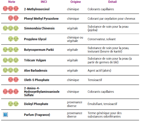 Par contre, en regardant la composition du produit, les promesses semblent fondre comme neige au soleil : il s’agit tout simplement d’une coloration chimique, semblable à celles que l’on retrouve dans tous les commerces, des colorations à base de fixateurs et révélateurs.